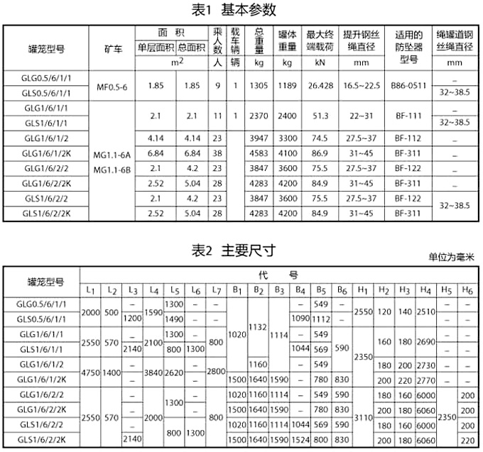 單繩罐籠由楔形連接裝置,抓捕器、罐體、罐內阻車器、導向裝置組成,如用于上下人,則必須設置斷繩保險器(防墜器),抓捕器根據制動繩布置形式可分為I型(對稱)抓捕和II型(對角)抓捕形式。常用單繩罐籠及配套防墜器的具體型號參數見附表。