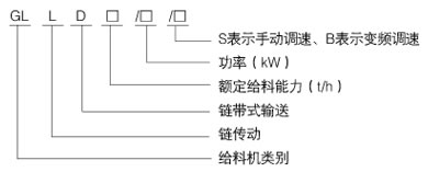 示例:客定給料能力為1000t/h,裝載功率為5.5KW的手動調(diào)速鏈帶式給料機型號表示為GLLD1000/5.5/S